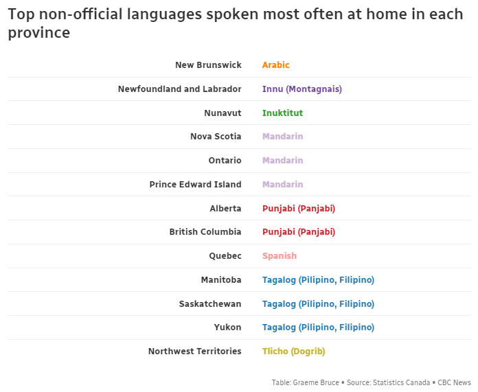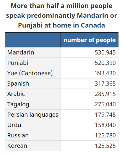 其中讲普通话的有53万人,讲旁遮普语的有52万人,讲粤语的有39万人。换句话说,大约有将近100万加拿大居民是在家讲中文的。