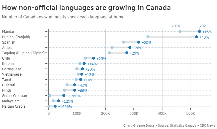 看这势头,占据“加拿大非官方语言之首”多年的普通话,位置将很快被取代。