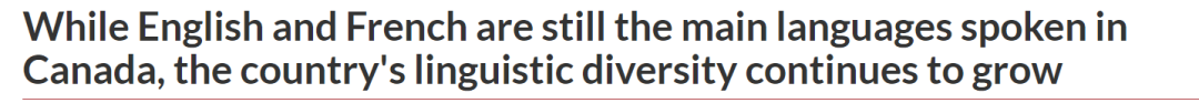报告显示,加拿大的语言多样性情况继续增长,虽然英语和法语依然是加拿大人最常用的语言,但是和2016年的数据相比,在家中是使用非官方语言进行交流的人增加了16%,达到460万,占总人口的比例为12.7%。