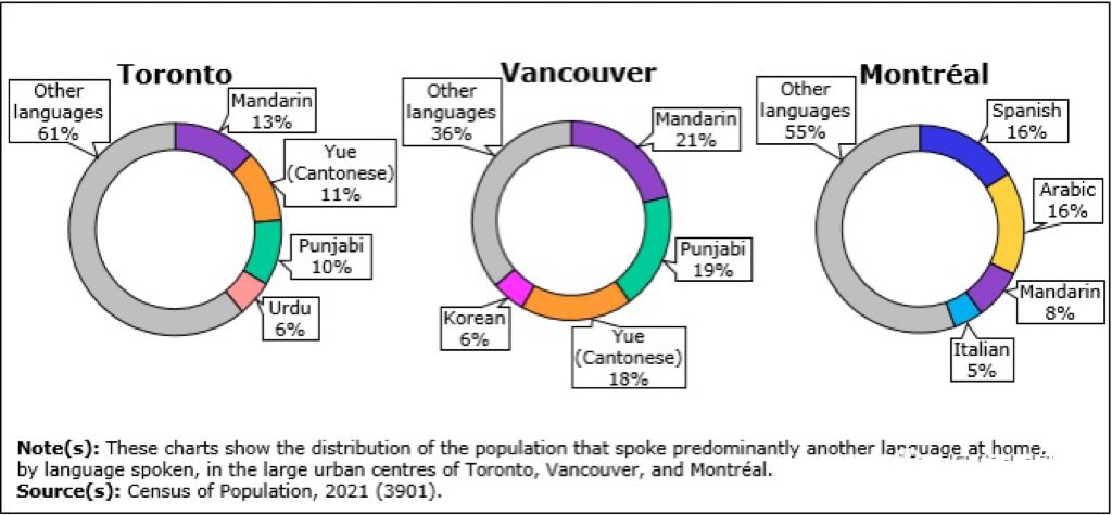 比如在多伦多和温哥华,超过四分之一的人在家中主要使用非官方语言,其中多伦多占比为26.3%,温哥华的占比为27.6%。
