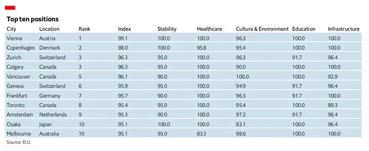 该报告是对全球173个城市从教育、医疗、文化和环境、稳定性和基础设施五个方面,用犯罪、恐怖事件、医疗服务水平、食材及消费品供应和教育等30个指标进行评估,继而按照分数进行排名的。