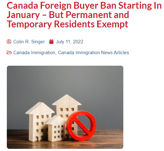 为了确保住房由加拿大人而不是外国投资者拥有,2022年预算宣布政府提出限制措施,禁止外国商业企业和非加拿大公民或永久居民的人获得非娱乐、加拿大的住宅物业。为期两年。”