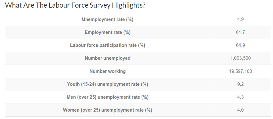 核心年龄(25-54岁)劳动人口的失业率仅为4.1%。其中,该年龄组的男性失业率为4%,女性为4.2%。这意味着该年龄组100个人里只有4个人因为各种原因失去工作。
