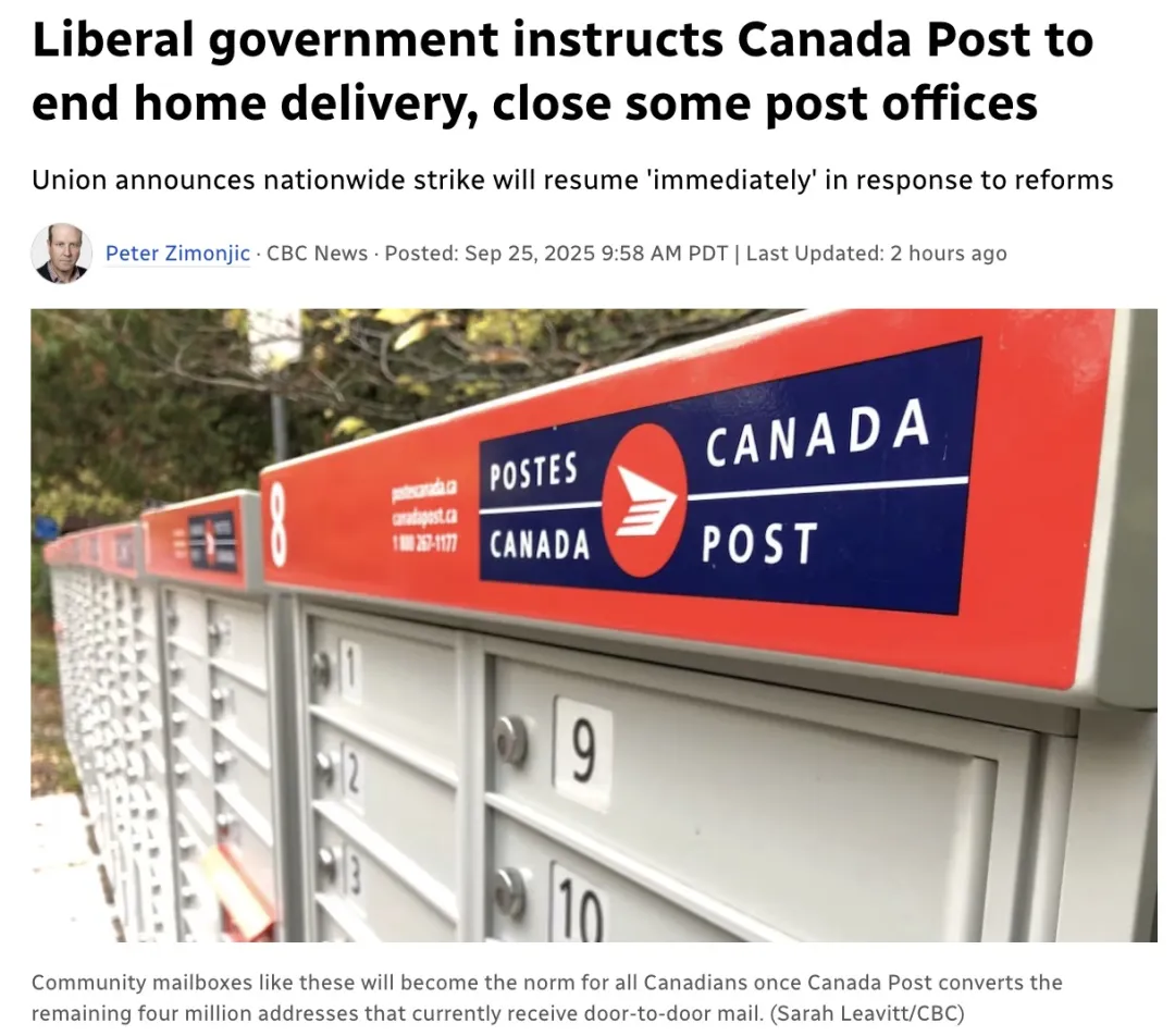 就在几分钟前,Canada Post 工会宣布立即启动全国性罢工,以强烈回应今早(9 月 25 日)联邦政府抛出的改革方案——这一方案涉及终止上门投递、关闭部分乡村邮局等措施,将影响多达400万户家庭。
