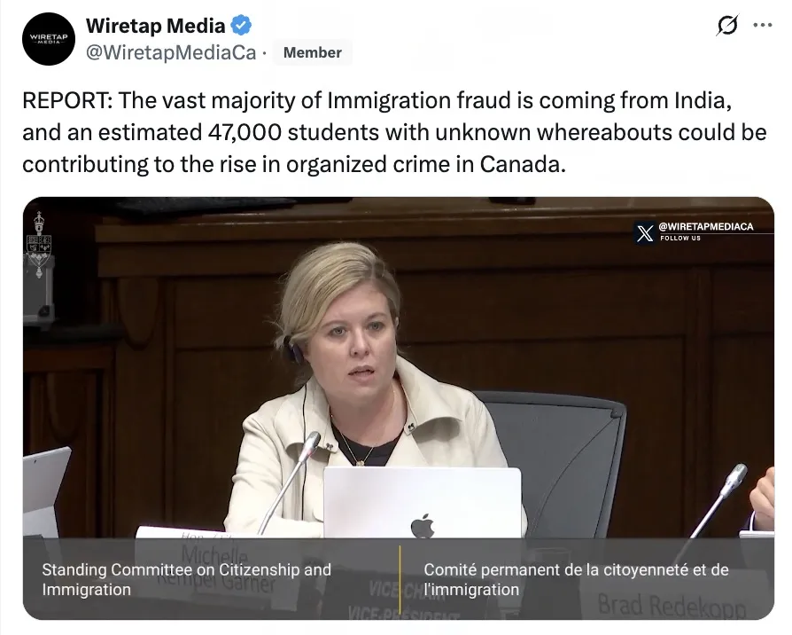 在2024年11月25日,加拿大下议院公民及移民事务常设委员会的听证会上,议员直接追问:“移民欺诈主要来自哪些国家?” 负责的移民官员回答称,印度是其中一个主要来源国。
