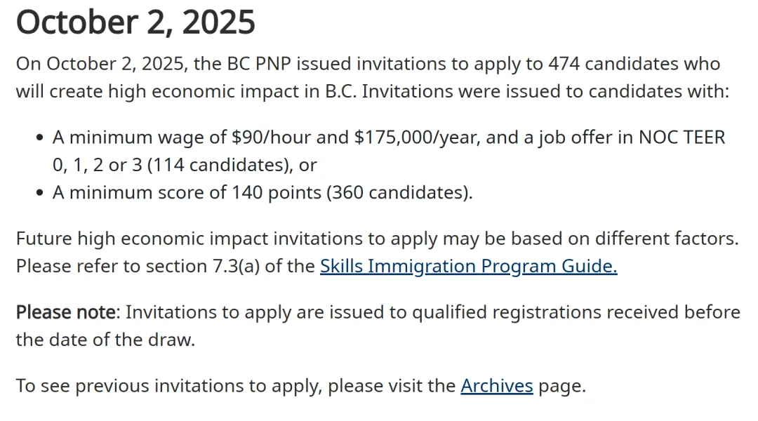 2025年5月8日,BCPNP仅发出94份邀请:47人是时薪105加元、从事TEER 0或1岗位的申请人,另47人是打分150分以上的候选人。