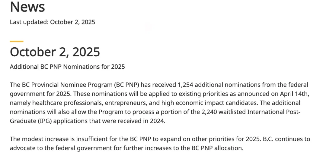 BC PNP已从联邦政府获得 2025 年度额外1,254个提名名额。