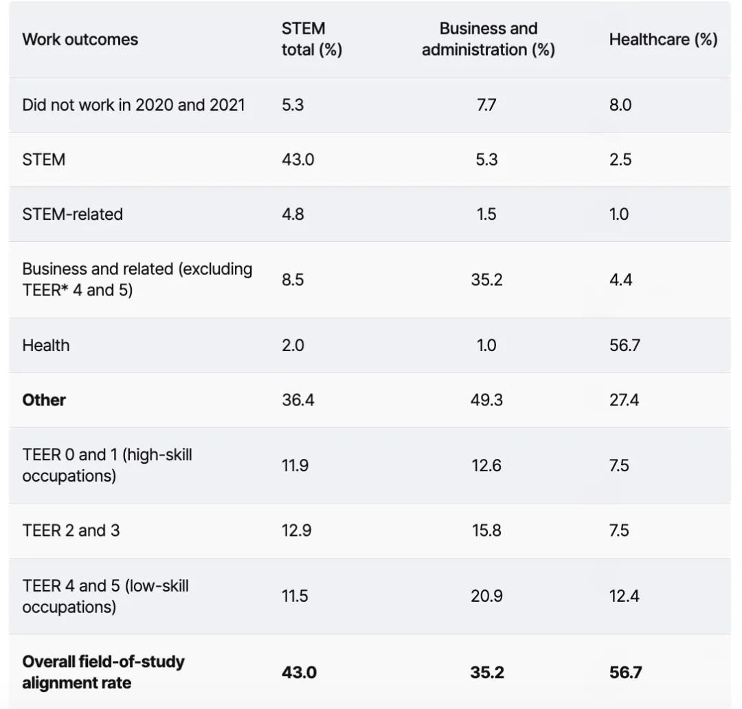本次统计局研究以2011—2021年间“先在加拿大学习、后取得永久居民(PR)”的人群为样本,核心观察的是“学习—职业对口率(alignment)”,即毕业后是否进入与所学专业同一大类的职业;同时辅以“2020—2021两年是否工作”以及TEER(0—5)分布作为就业质量的侧写(需要说明的是,这里的“是否工作”并非劳工调查口径的失业率)。