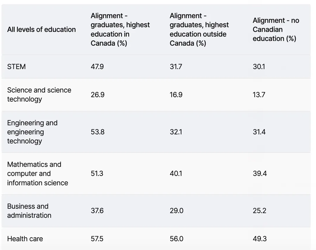 尤其是STEM:在加拿大学得最高学历,对口率提升显著(+16个百分点),并且更容易获得本地实习/导师推荐/雇主关系。