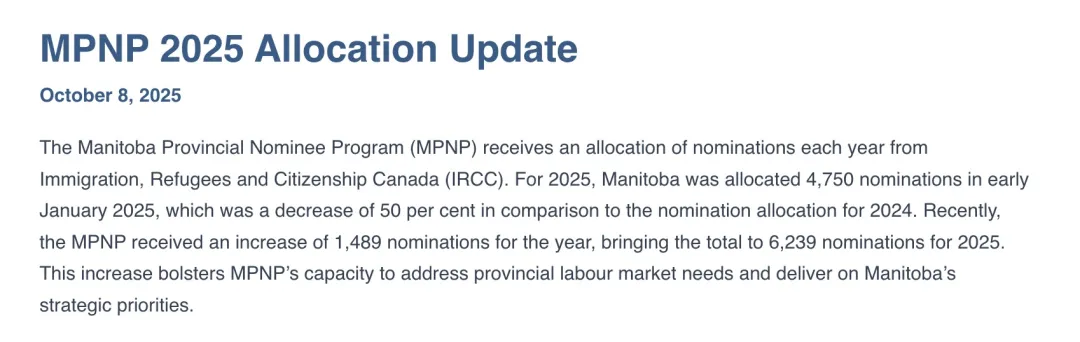 2025年10月8日9,曼尼托巴省宣布在原来4,750个名额的基础上增加了1,489个,增幅约为31%,年度总量达到6,239个。