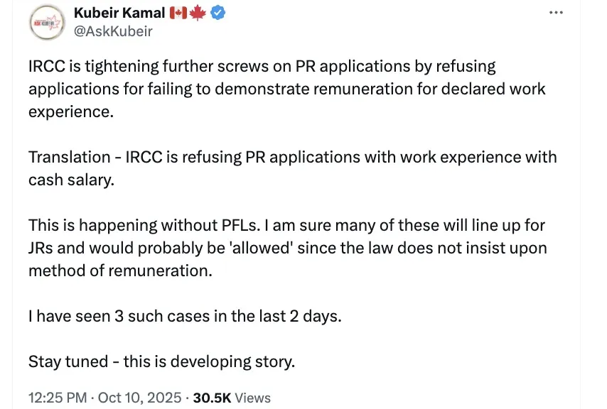 起因是有移民顾问在社媒X和Facebook上表示,近期出现以“未能证明有报酬”为由的拒签;现金薪资的经历更容易被质疑。