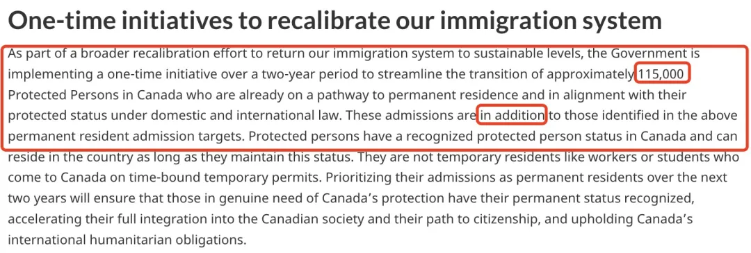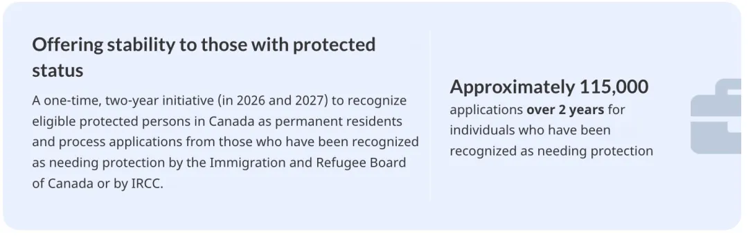 未来两年,联邦政府将以一次性方式,为约11.5万名已在加拿大境内、被正式认定为“受保护人(Protected Persons)”的人办理/确认永久居民(PR)身份。