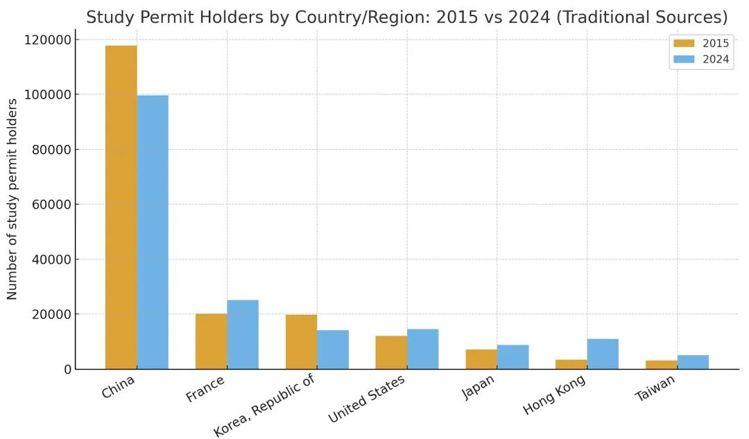 在2017年之前的⼗⼏年⾥,中国稳居加拿⼤第⼀⼤留学⽣来源国。2015年底,在加中国留学⽣有11.7万⼈;⽽到2024年底,这⼀数字不增反降,回落⾄10.1万⼈。