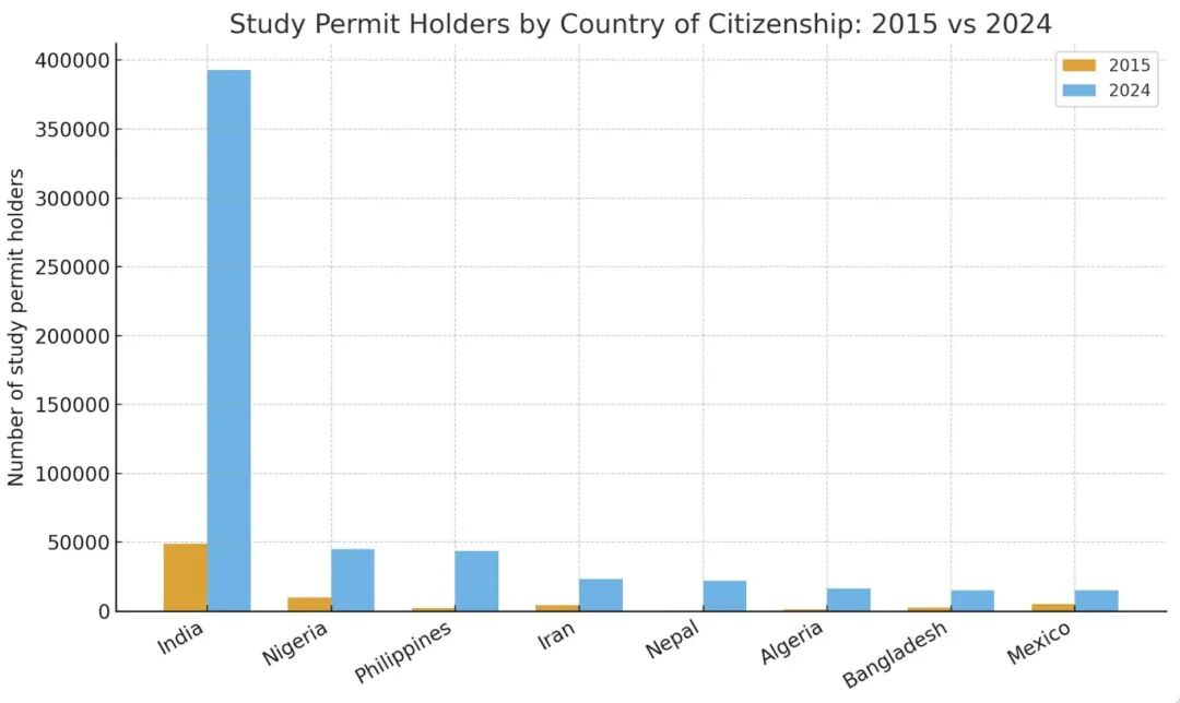 此外,伊朗、阿尔及利亚、孟加拉、墨⻄哥等国,均贡献了数倍到数⼗倍的增⻓,并悉数跻⾝加拿⼤留学⽣来源国前⼗。