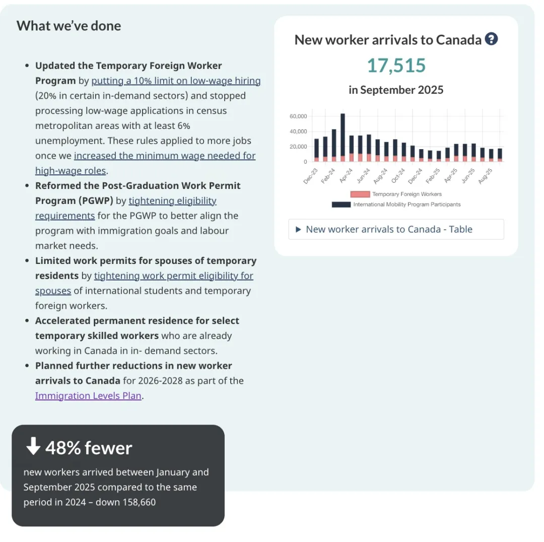2025 年 1~9 月,加拿大新入境外国工人(工签)总人数为171,805 人,比 2024 年同期的 330,470 人减少了整整158,665 人,降幅约为48%!