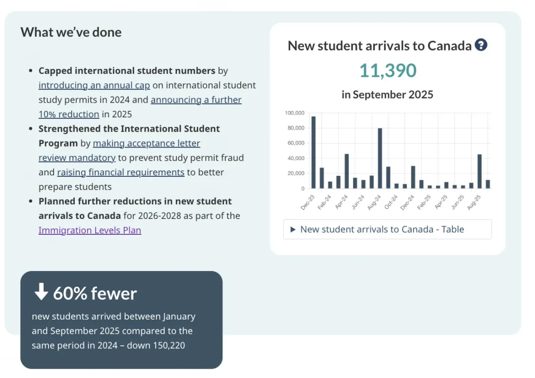 就在今天,移民部更新了新算法口径下的临时居民入境数量,而真实的数据令人震惊:2025年截至9月底,加拿大新入境的留学生人数只有10万人,据此推算,全年新入境留学生数量不足15万!