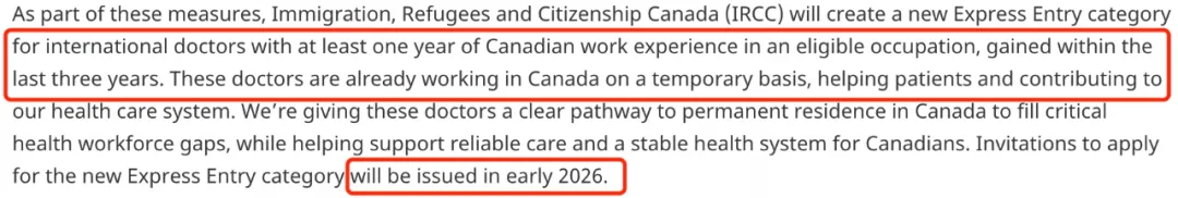 IRCC 明确表示:这一新类别是为了让已经在加拿大医疗体系中执业的医生,能够更快速地从临时身份过渡到永久居民,避免他们继续陷入 CRS 积分竞争或长期依赖临时工签的困境。