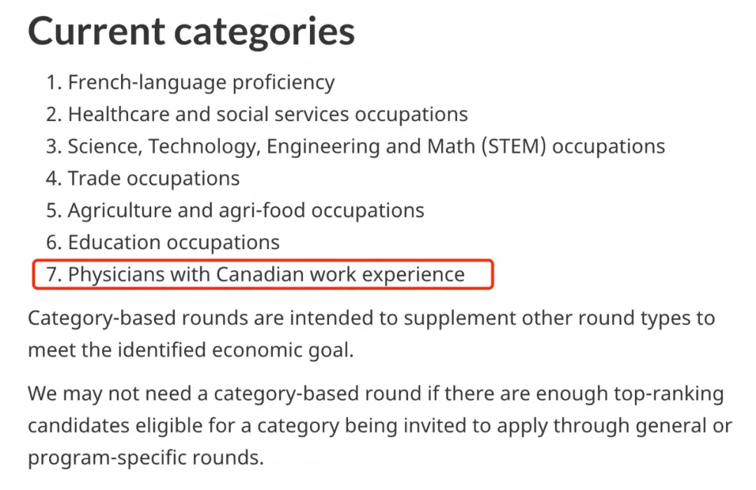 目前,在“基于类别邀请”的官网页面上,“具有加拿大工作经验的医生”已经被列入清单,成为第 7 个类别。
