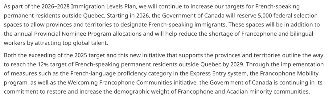 从2026年起,预留5,000个联邦选拔名额,专门用于支持省和地区提名法语移民;这些名额,将作为省提名年度配额的“额外补充”。