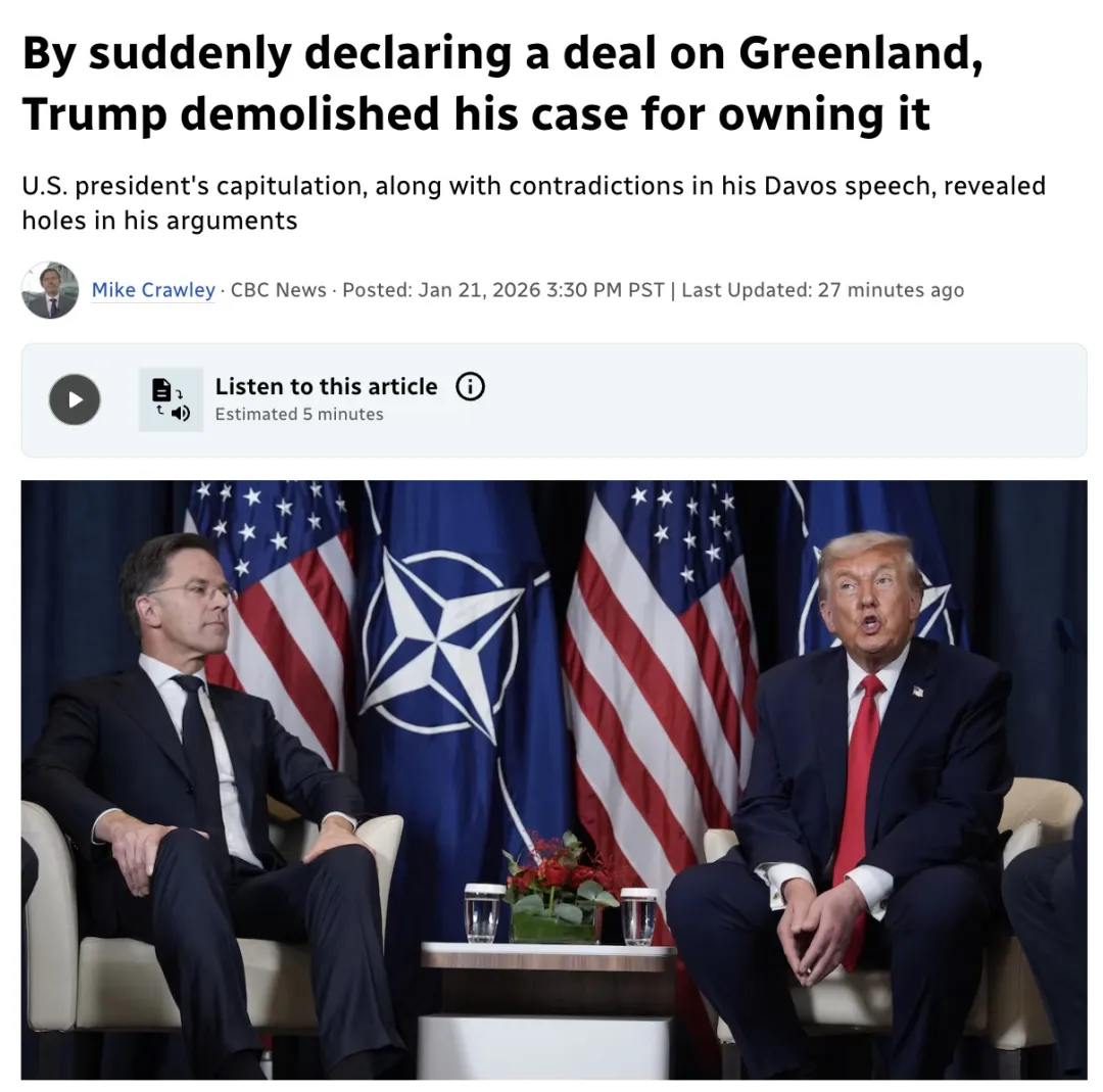而特朗普在达沃斯宣布已形成所谓“框架性安排”,并暂缓部分关税威胁,也被多家媒体解读为:围绕格陵兰的讨论,已经不仅停留在象征层面,而是在真实运行的谈判与博弈之中。