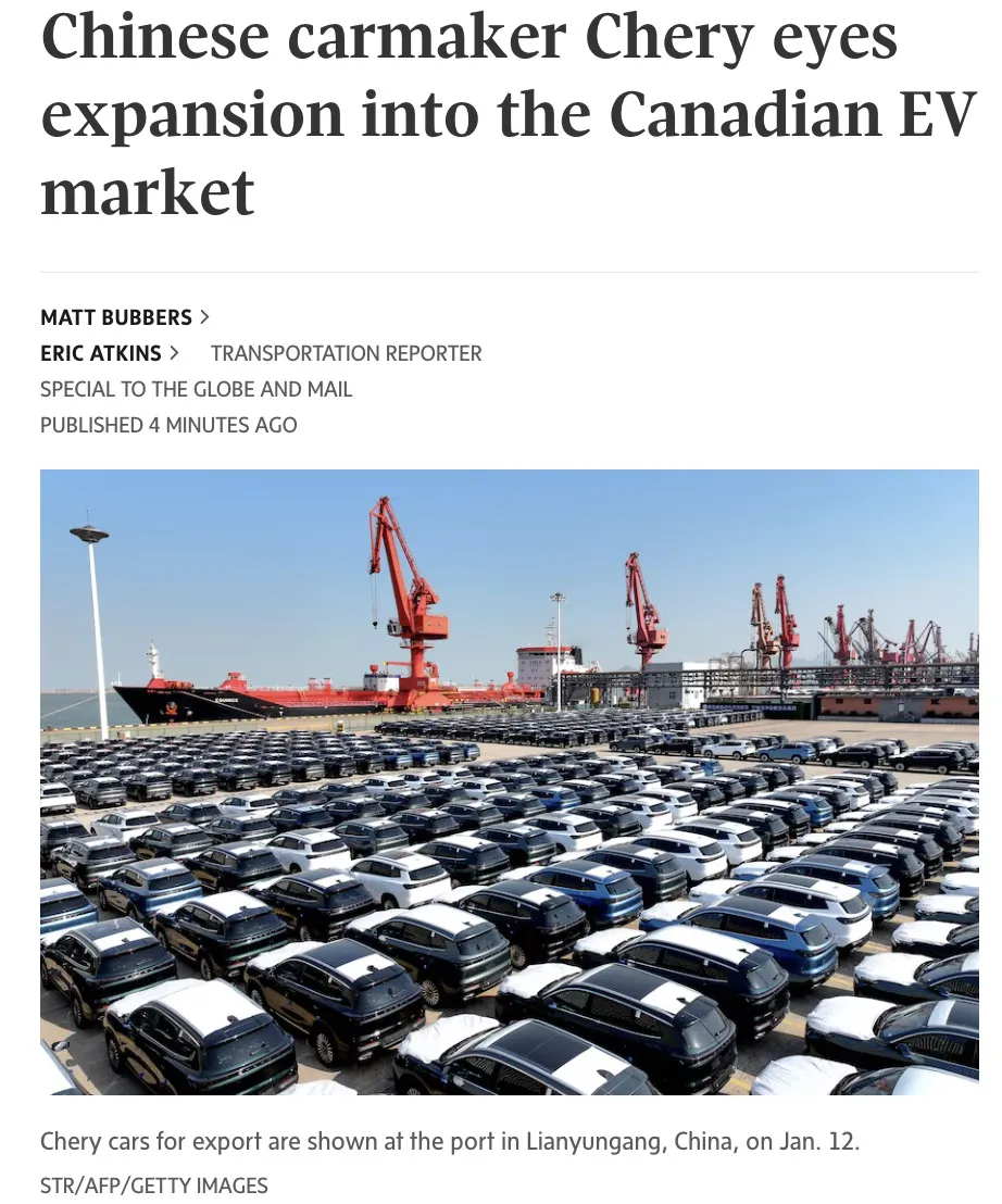 今天(1月22日),加拿大本地媒体《环球邮报》发文披露,中国汽车制造商奇瑞(Chery),正在为进入加拿大市场搭建完整本地体系。
