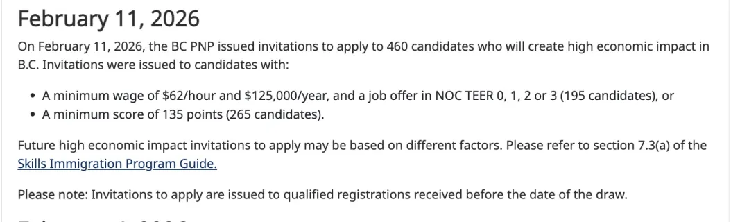 结合官方最新公布数据与今年整体节奏,可以清晰看出:BC省提名2026年的邀请趋势已经逐渐明朗。 根据BC省提名官网最新公布: 2026年2月11日共邀请460人,属于“高经济贡献(High Economic Impact)定向邀请”: 高薪岗位(≥$62/小时 或 ≥$125,000/年):195人 高分候选人:最低 135分,共 265人 这是 BC省提名2026年以来发出的第二次技术移民邀请。 上一次是在一周前的2026年2月4日,当时共邀请429人,同样属于“高经济贡献(High Economic Impact)定向邀请”: 高薪岗位(≥$70/小时 或 ≥$145,000/年):206人 高分候选人:最低 138分,共 223人 也就是说,随着BC省持续发放邀请,高薪类别也继续下调,时薪下降到62/小时!覆盖人群更加广泛; 高分候选人最低分已从138下降至135,出现小幅回落,但整体仍处高位区间。 目前BC省提名候选池约有1.1万人,而全年配额只有5200多个,所以竞争依然激烈。 根据省政府 2月8日公布的候选池结构: 100–109分段人数最多 ,竞争最激烈; 130+分段人数明显较少,更容易被邀请。 因此可以得出当前最现实判断: 130分以上:仍处主流获邀区间,机会较大; 120分以下:获邀难度明显上升。 因此:130分以上的申请人机会很大,但120以下的申请人获邀难度明显上升。 综合今年政策与邀请节奏,BC PNP呈现出三个清晰趋势: 相较于2025年的“遥遥无期”,2026年的BC省提名发邀频率明显提高,虽然规模不是很大,而是采取精准筛选模式,但相较去年还是增加不少。 高薪岗位、医疗、技工、基础设施相关职业明显更容易获邀,体现“经济价值优先”的政策方向。 目前的高薪类已经降到了62/小时,年薪12.5万,覆盖范围大大增加。 目前我们合作的BC本地高薪雇主资源,65刀及以下的时薪,主要集中在管理层与高经济贡献岗位,这类职位正是BC省提名体系中最具优势的人群之一,包括: CTO(首席技术官) CFO(首席财务官) Sales Manager(销售经理) 房地产公司 VP / 高管 HR Manager(人力资源经理) 感兴趣的朋友记得联系顾问:baxianchuguo 当前分数的常见区间约 130–140分,短期内出现大幅下降的可能性较低。 对申请人来讲,如果你已注册BC PNP,分数高于130,有稳定雇主,那么2026年有较高概率获邀! 如果分数低于120,则需要尽快调整策略。因为能否顺利获邀,和你的多方因素相关,比如:职业匹配度、分数结构、雇主质量、注册策略等等。 如果你想判断: 当前分数是否具备获邀概率 是否需要换雇主 / 调整职业 / 提升分数 何时最可能获邀 是否应转向RCIP / EE / 其他省提名 可私信我们的顾问进行咨询:baxianchuguo