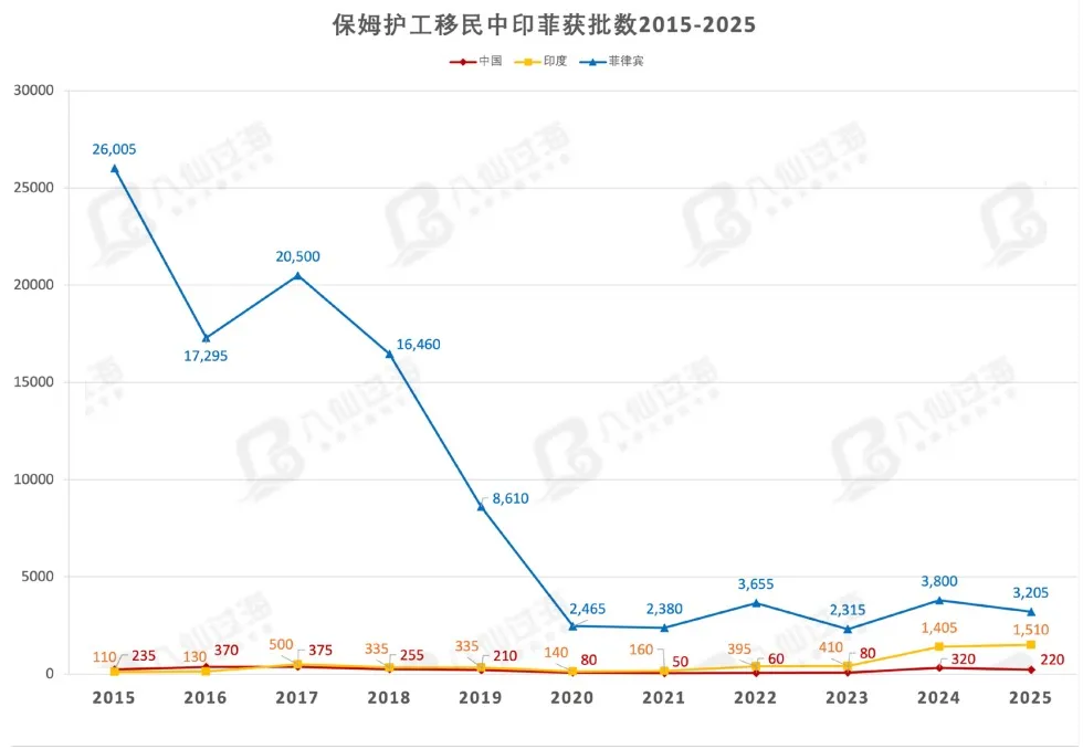 如果说印度代表的是“高技能结构优势”,那么菲律宾代表的,是另一种完全不同的模式——稳定供给型来源国。