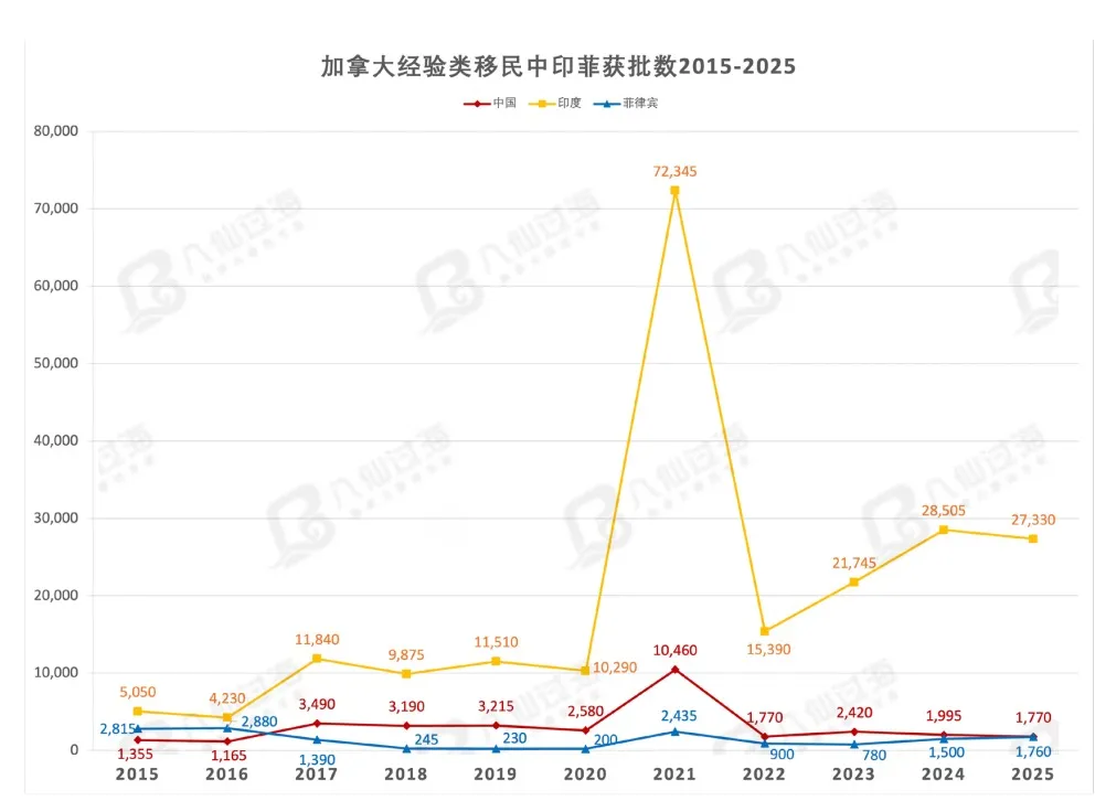 在过去二十多年里,菲律宾几乎始终稳居加拿大主要移民来源国前列。其特点不是快速增长,而是长期稳定、波动不大。