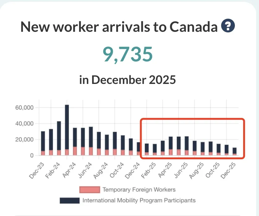 2024年1~12月份,加拿大新入境工签持有人(TFW + IMP)约为392,000 人,而2025年全年只有208,000 人,大约减少了184,000人,下降幅度47%!