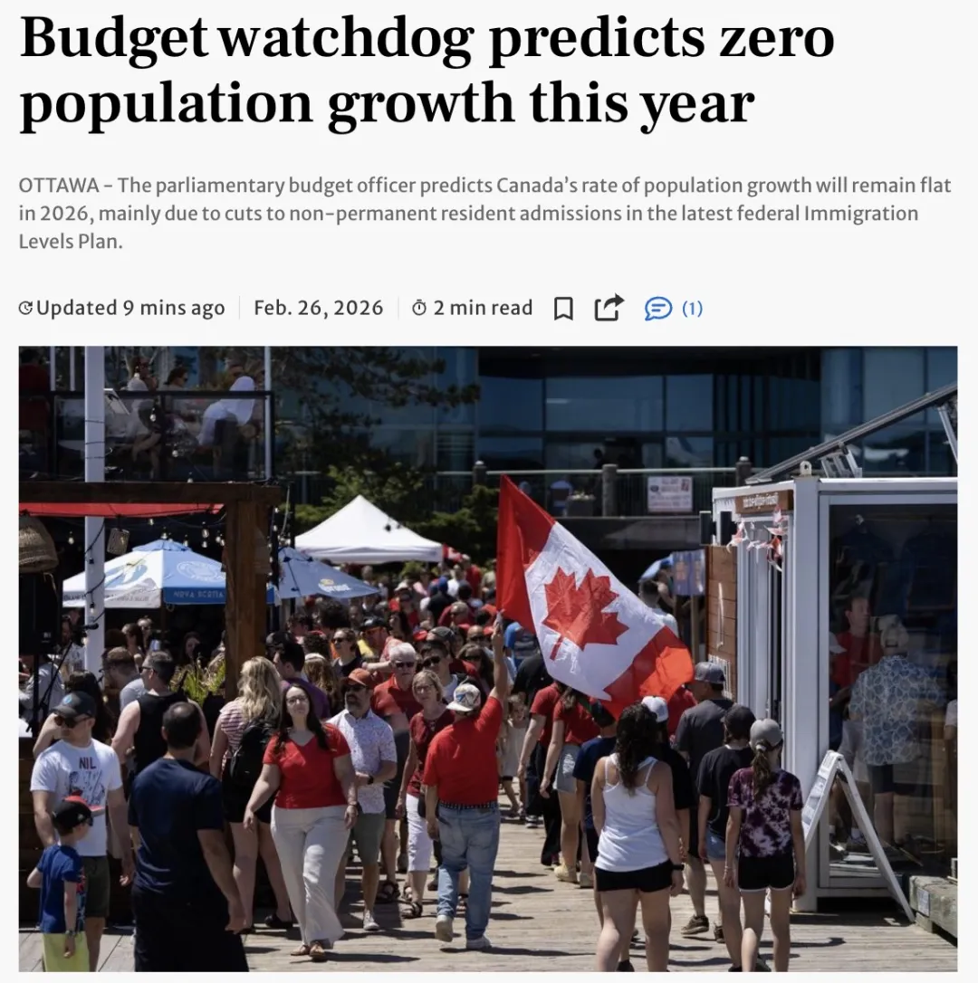 今天(2月26日),加拿大本地媒体报道称:加拿大议会预算办公室(PBO)最新预测,2026年加拿大人口增长率将维持在0%。如果这一预测兑现,这将是加拿大连续第二年出现人口“零增长”。