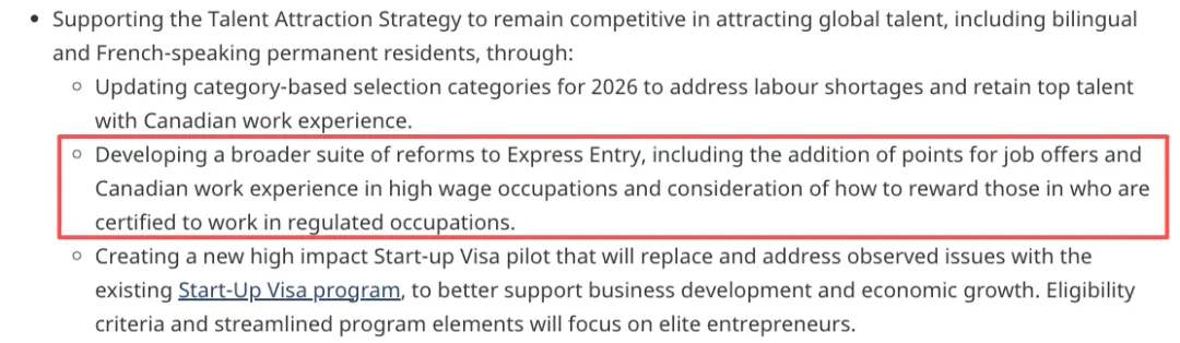 报告指出,为支持加拿大的 “人才吸引战略”(Talent Attraction Strategy)、吸引全球高端人才并保持国际竞争力,移民部正在研究一系列更广泛的EE改革措施。其中包括: