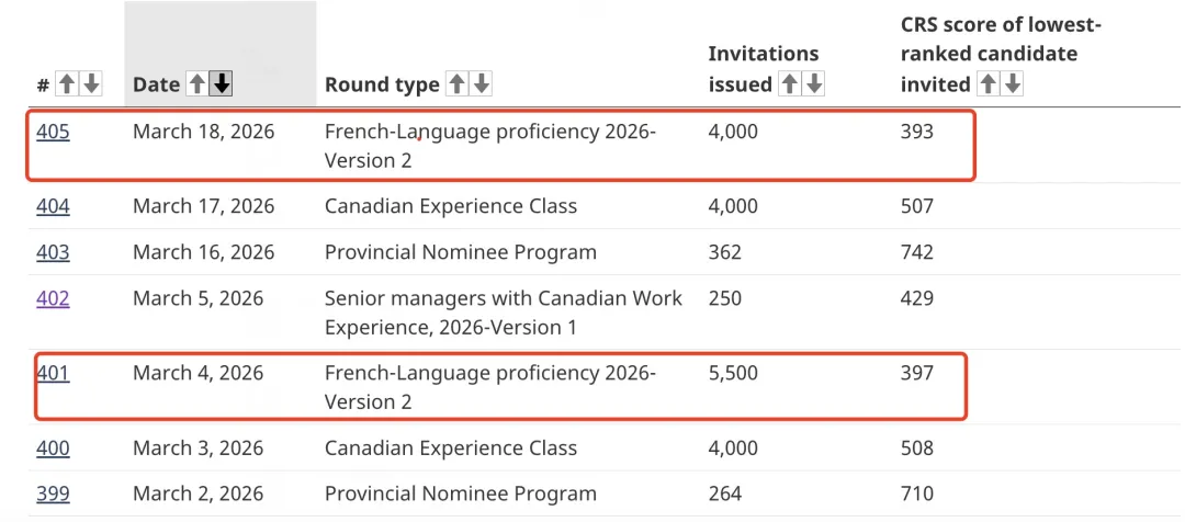 更关键的是邀请分数——多轮法语类别邀请的最低分数已经下降到400以下(如393分),不仅明显低于常规分数线,和其他类别相比,也是占尽优势。