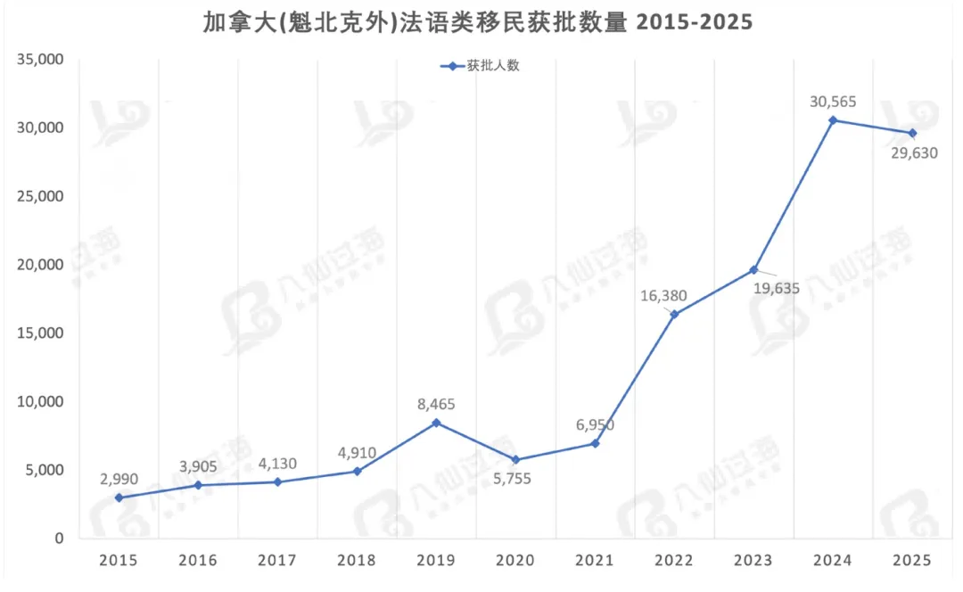 从整体数据来看,2025年加拿大继续提高了法语移民的数量和比例——2025年,加拿大在魁省以外地区共接纳约29,500名法语永久居民,虽人数略低于2024年,但占比达到8.9%,超过既定的8.5%目标!