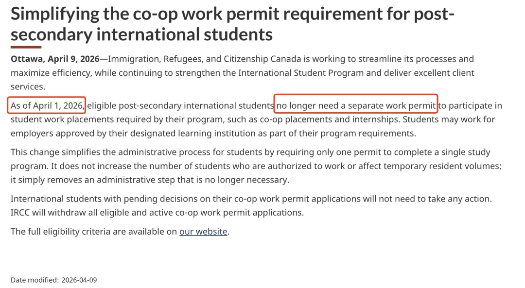 自2026年4月1日起,大专及以上留学生不再需要单独申请Co-op实习工签!
