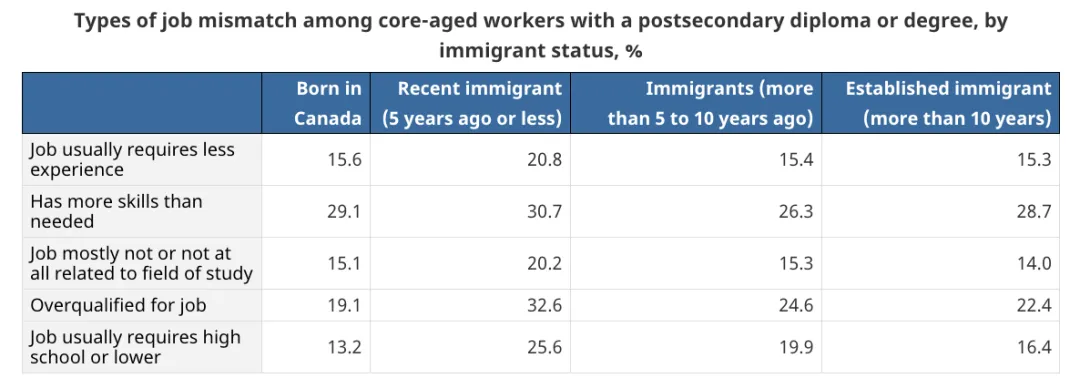 在25至54岁、拥有大专及以上学历的新移民中,约32.6%认为自己学历高于当前工作的要求;而在加拿大本地出生人群中,这一比例仅为19.1%。