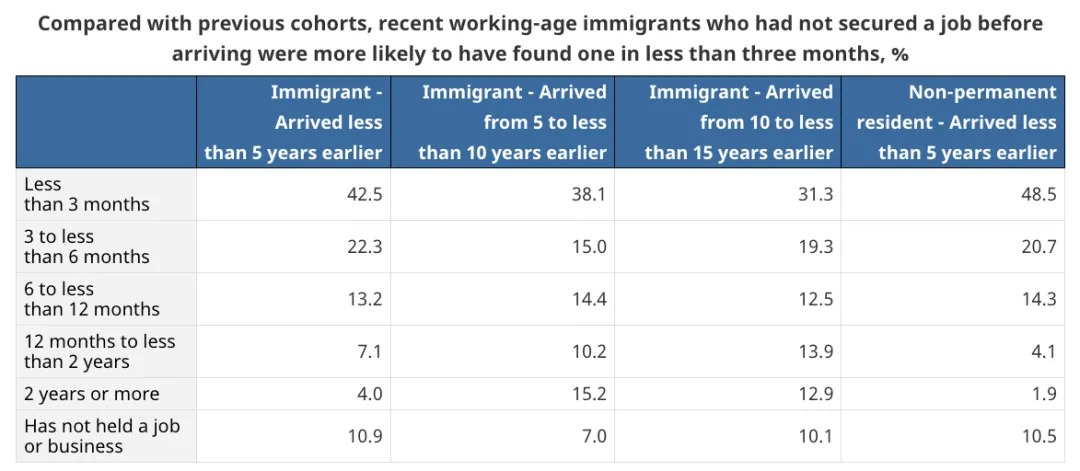 从这组数据来看,新移民进入劳动力市场的速度正在明显提升,“刚落地找不到工作”这一长期困扰移民的问题,似乎正在被缓解。