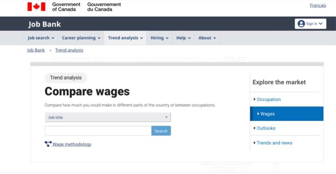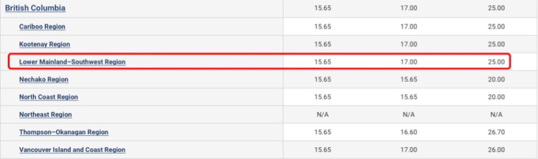 关于各个职业的工资标准,则是依赖于加拿大Job Bank提供的区域性工资标准。各省每个职业的工资分为高中低三档,雇主给外籍员工的工资不能低于中等工资标准。比如,当我们在Job Bank上查找大温以内地区餐饮主管的工资标准时,有以下三个时薪档位: